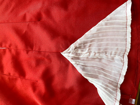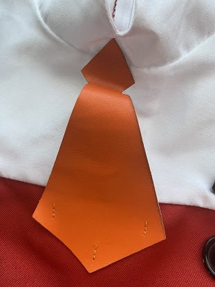 The orange tie is made with fake leather and sewn in the top and the bottom.