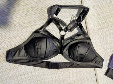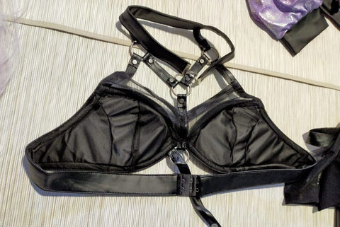 The bra is made out of leatherette. It is a bit big for me in the backside but it is really easy to fix.