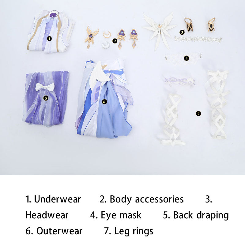 Included Items: Inner garment, back accessories, headdress, eye mask, back drape, outer garment, leg rings.