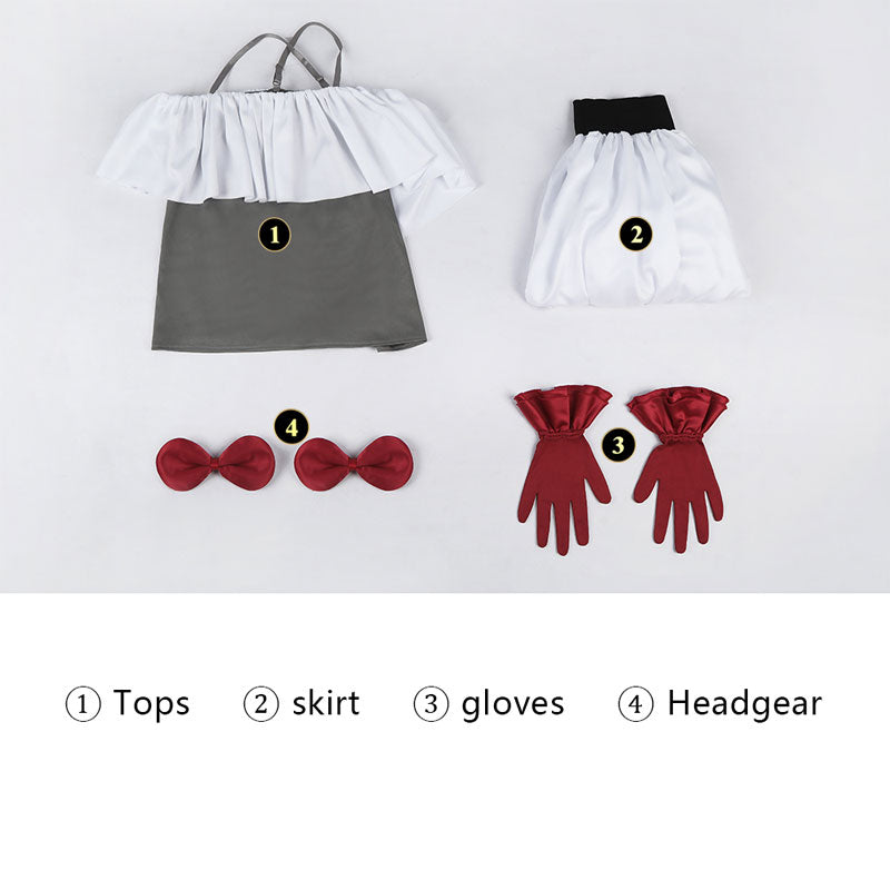 Included: 1. Top 2. Skirt 3. Gloves 4. Headwear