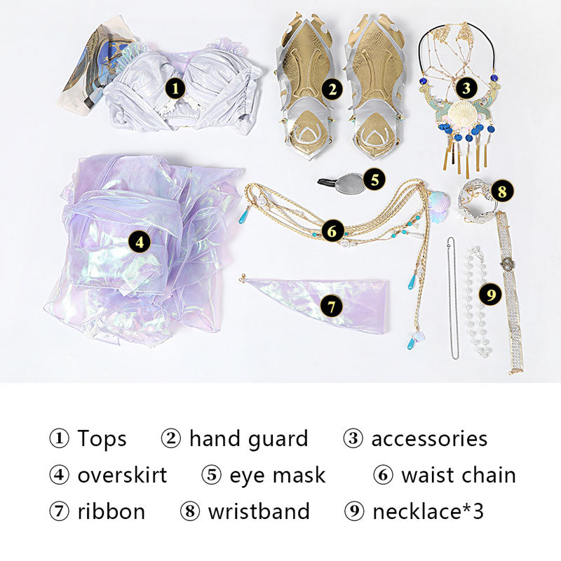 Included: Underwear, transparent skirt, leggings, green ring jewelry, shawl, girdle, eye mask, neck chain, necklace, shoulder armor, bracelet, hand guard, shell anklet, anklet, leg ribbon, goldfish, button jewelry, two finger gloves.